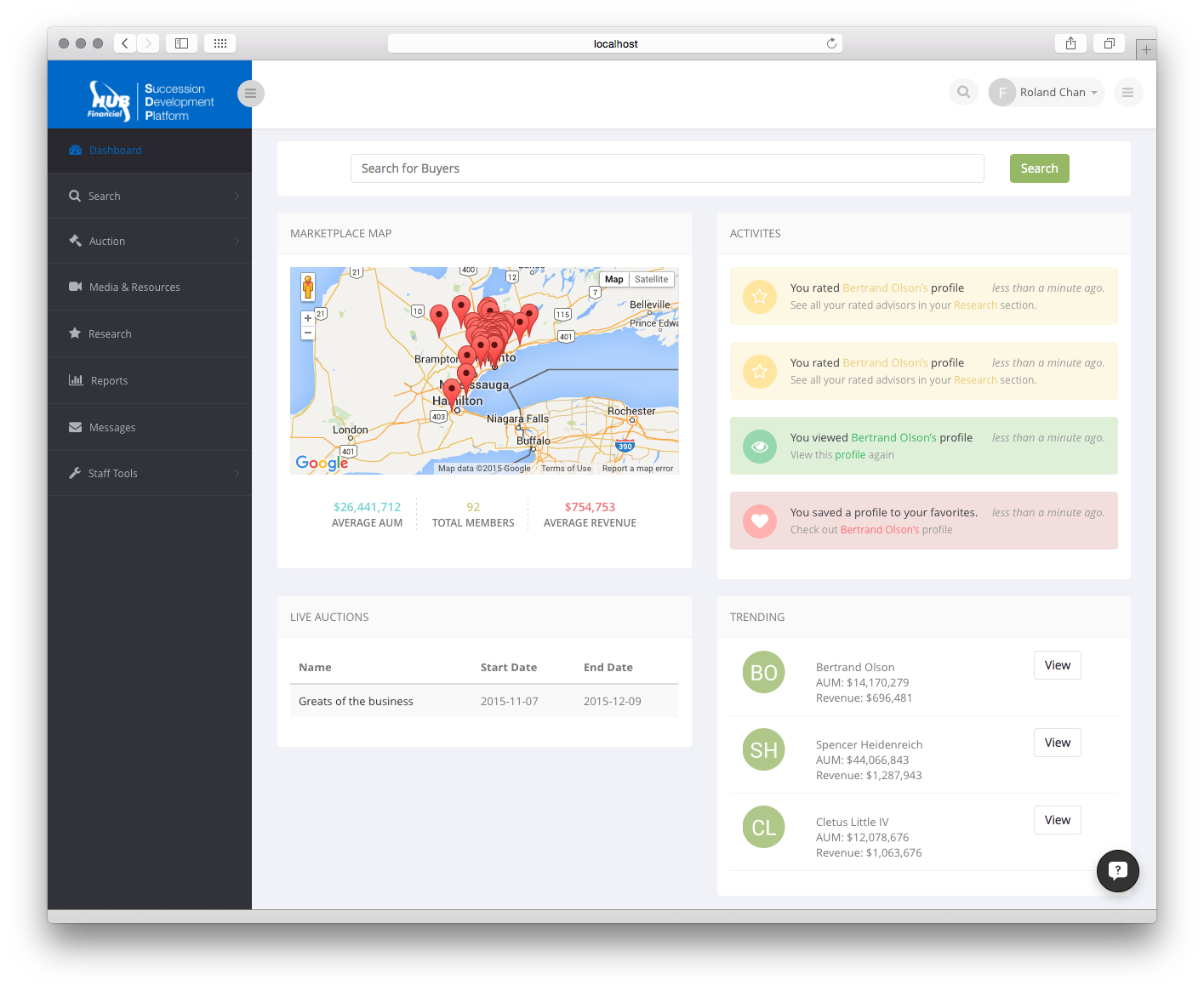 Your Dashboard will be your control panel that will centralize all information for the marketplace. Maps, activity, what's trending, and upcoming auctions are just some of the details available on the dashboard.